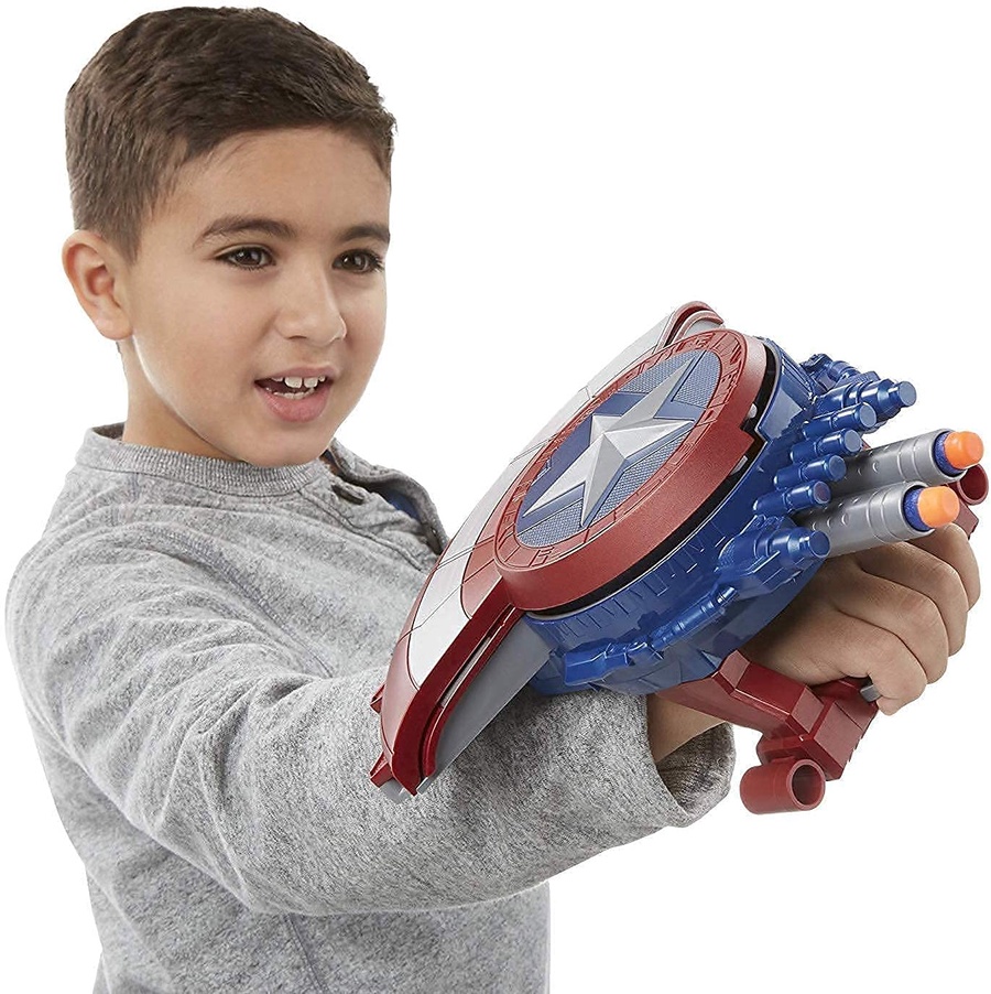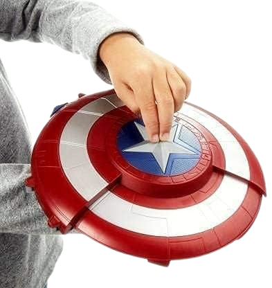 الدرع معمول بنفس تفاصيل وألوان كابتن أمريكا اللي في أفلام مارفل، مع نجمة ثلاثية الأبعاد لامعة في النص. التصميم مش بس شكله حلو، ده كمان بيدي إحساس واقعي لأي طفل إنه فعلاً بقى بطل خارق